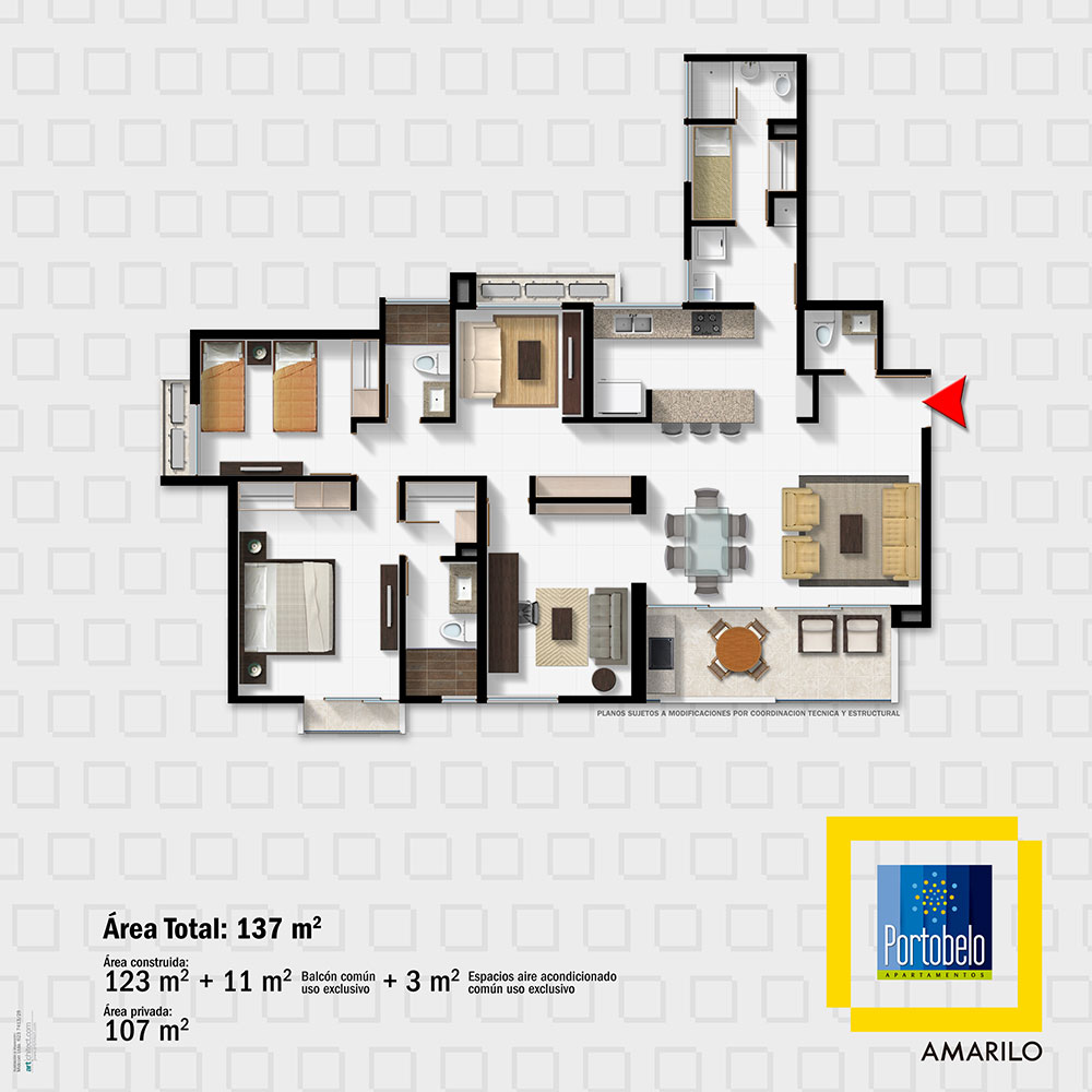 Portobelo cuenta con 192 apartamentos de 137 m2 a 210 m2, distribuidos en 3 torres de 16 pisos y 4 apartamentos por piso. Cuenta con 595 parqueaderos en total, de los cuales 480 son privados, 96 de visitantes y 19 de discapacitados. Conjunto cerrado con piscina, jacuzzi con zona de relajación, gimnasio, parque infantil, salón social, lobby car.